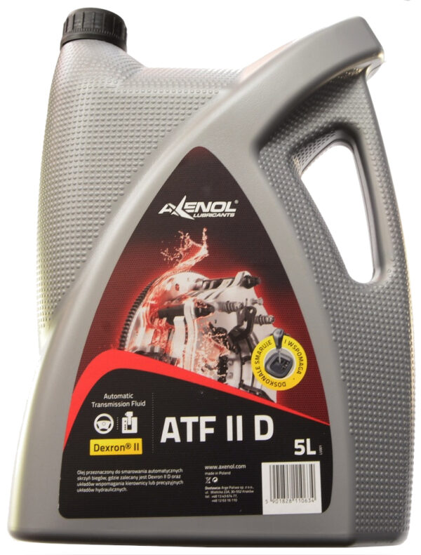 ATF II D do automatycznych przekładni samochodowych otrzymywany jest z rafinowanych destylatów ropy Ź naftowej uzupełnionych pakietem dodatków uszlachetniających o działaniu przeciwutleniającym, Ź przeciwkorozyjnym oraz poprawiającym własności smarne i odporność na pienienie, co gwarantuje spełnienie Ź wymagań stawianych w specyfikacjach zagranicznych i krajowych. Olej ATF II D wykazuje szereg zalet. To wysokiej jakości, mineralny olej ATF II D przeznaczony jest do Ź stosowania w automatycznych przekładniach samochodów osobowych, ciężarowych i autobusów, w których Ź producent zaleca stosowanie oleju typu Dexron; II D. Olej ATF II D zalecany jest również do stosowania w urządzeniach wspomagających układy kierownicze, w Ź sprzęgłach hydraulicznych samochodów osobowych i ciężarowych oraz w układach hydraulicznych wymagających Ź stosowania olejów typu ATF.